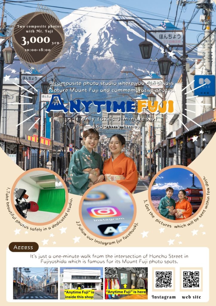 AnytimeFuji is a composite photo studio located along “Honcho Street”.